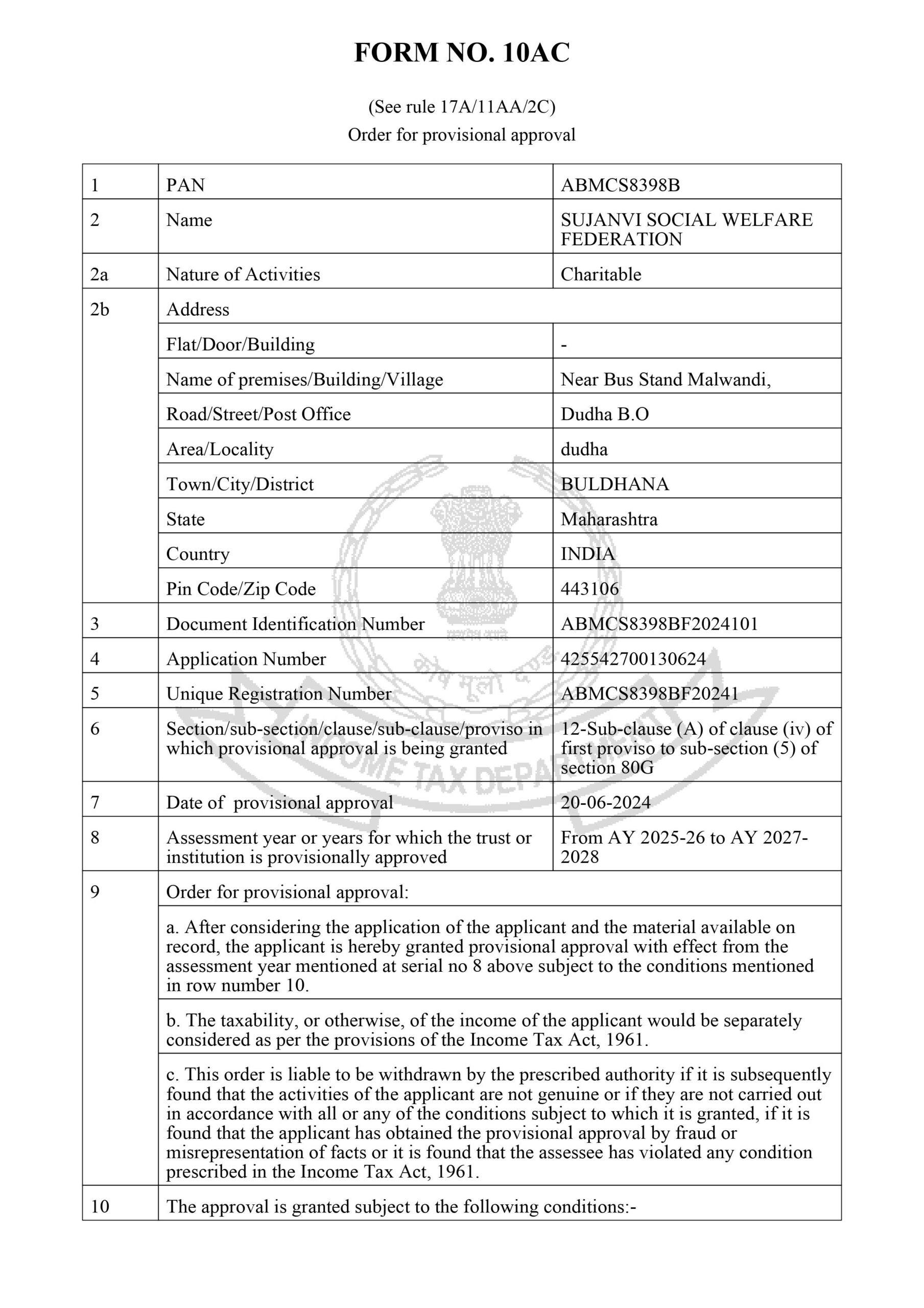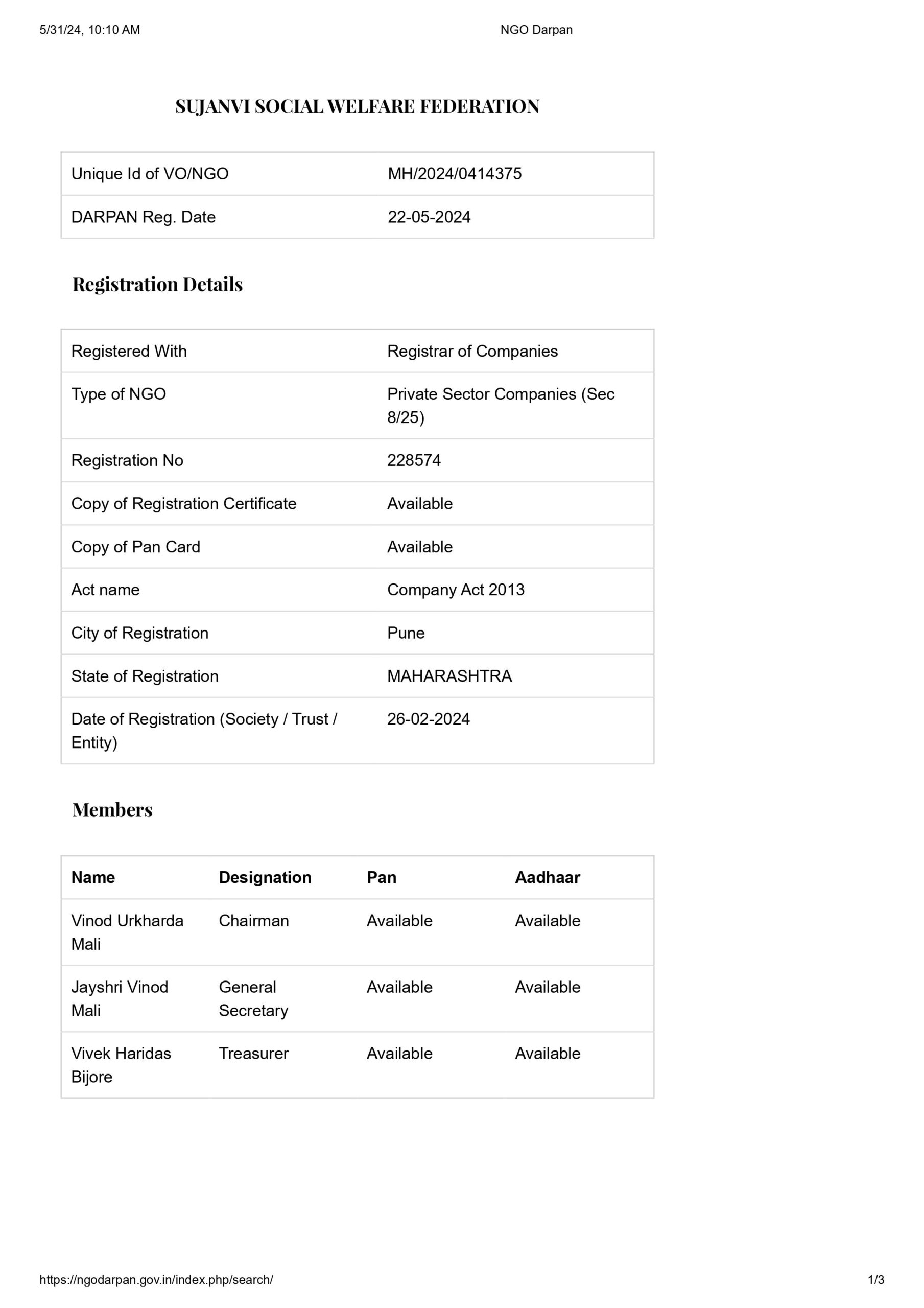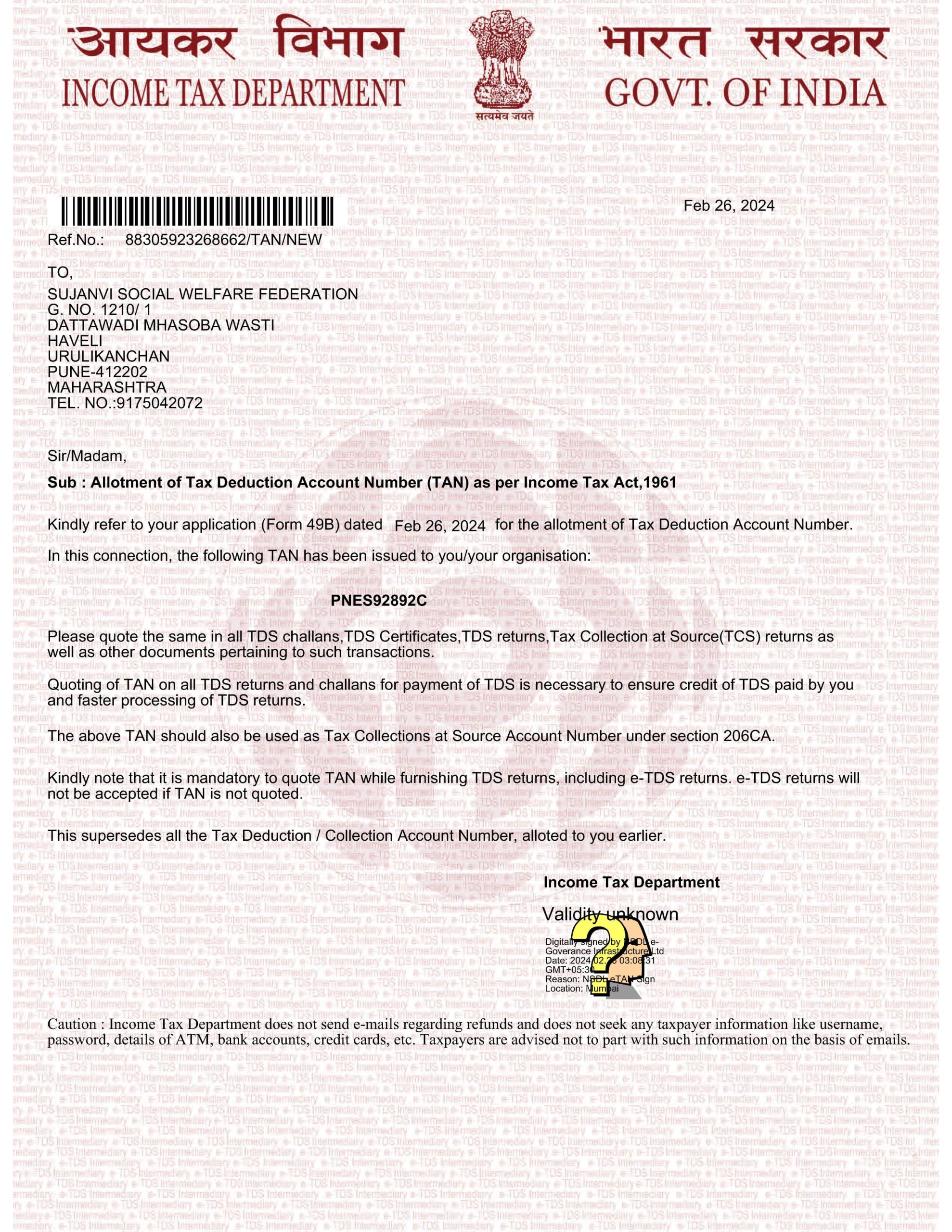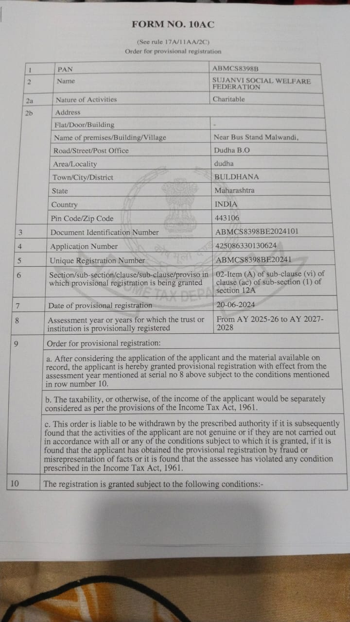 Documents Gallery Sujanvi Social Welfare Federation 12A 80G AOA Authorization Letter Ministry of Corporate Affairs MOA NGO DARPAN PAN LEI Certificate TAN Registration Certificate SUJANVI SOCIAL WELFARE FEDERATION 9001 2015 Q2A