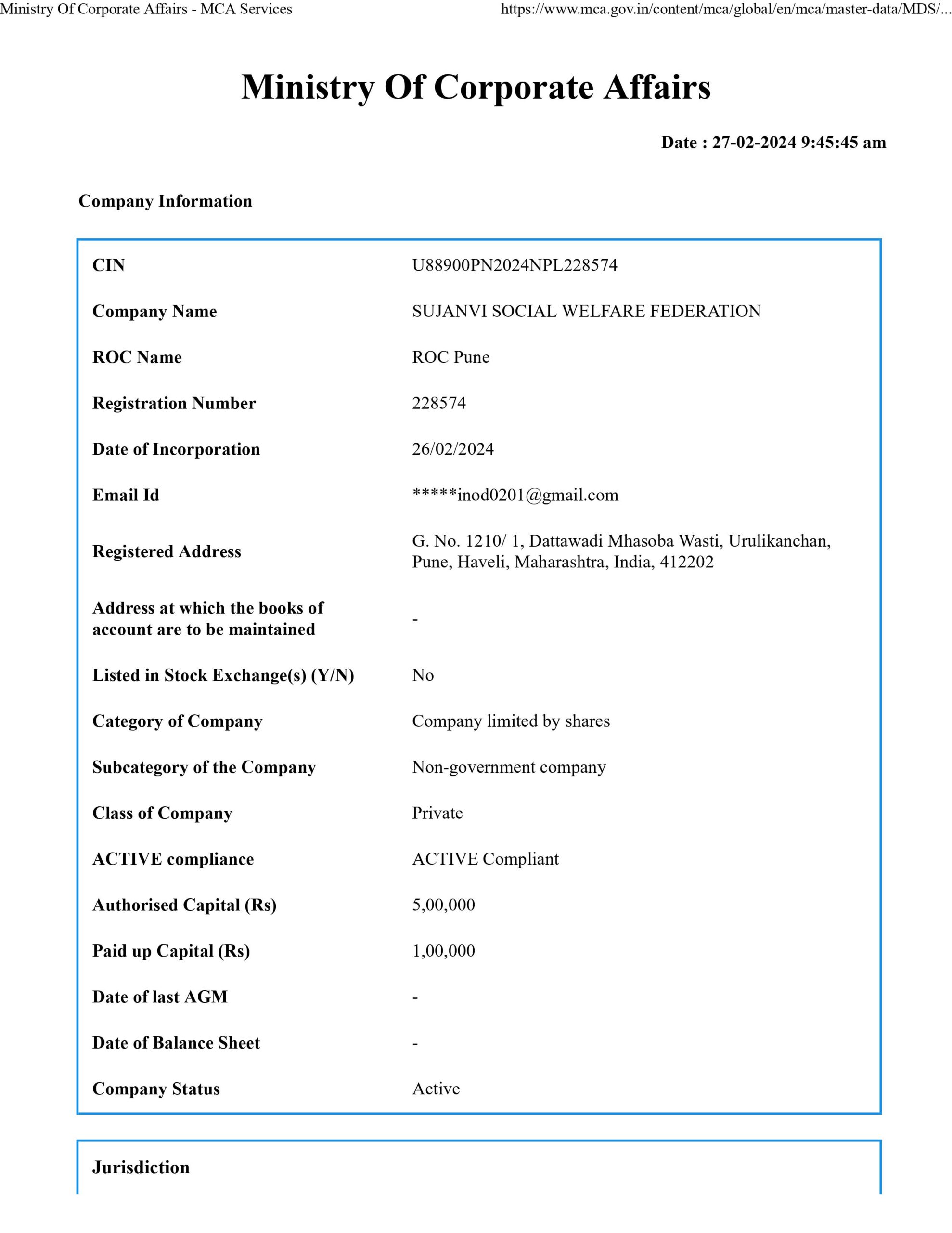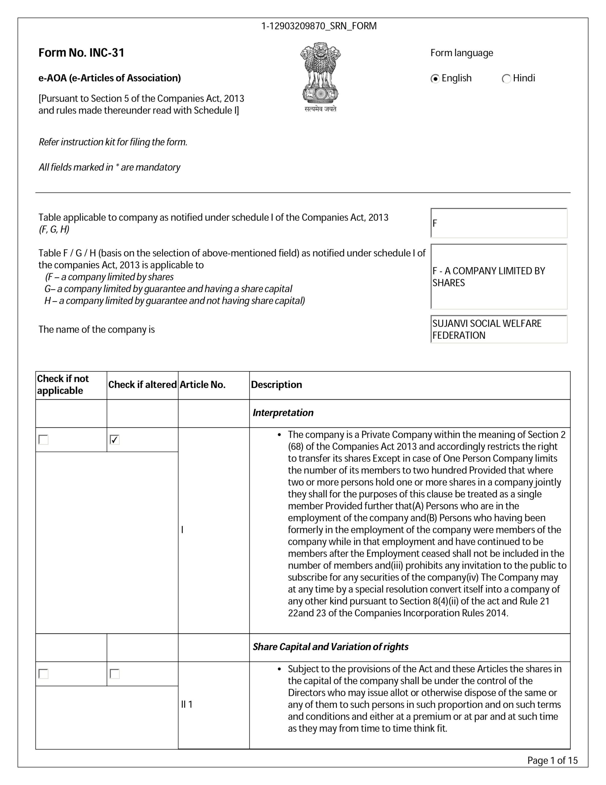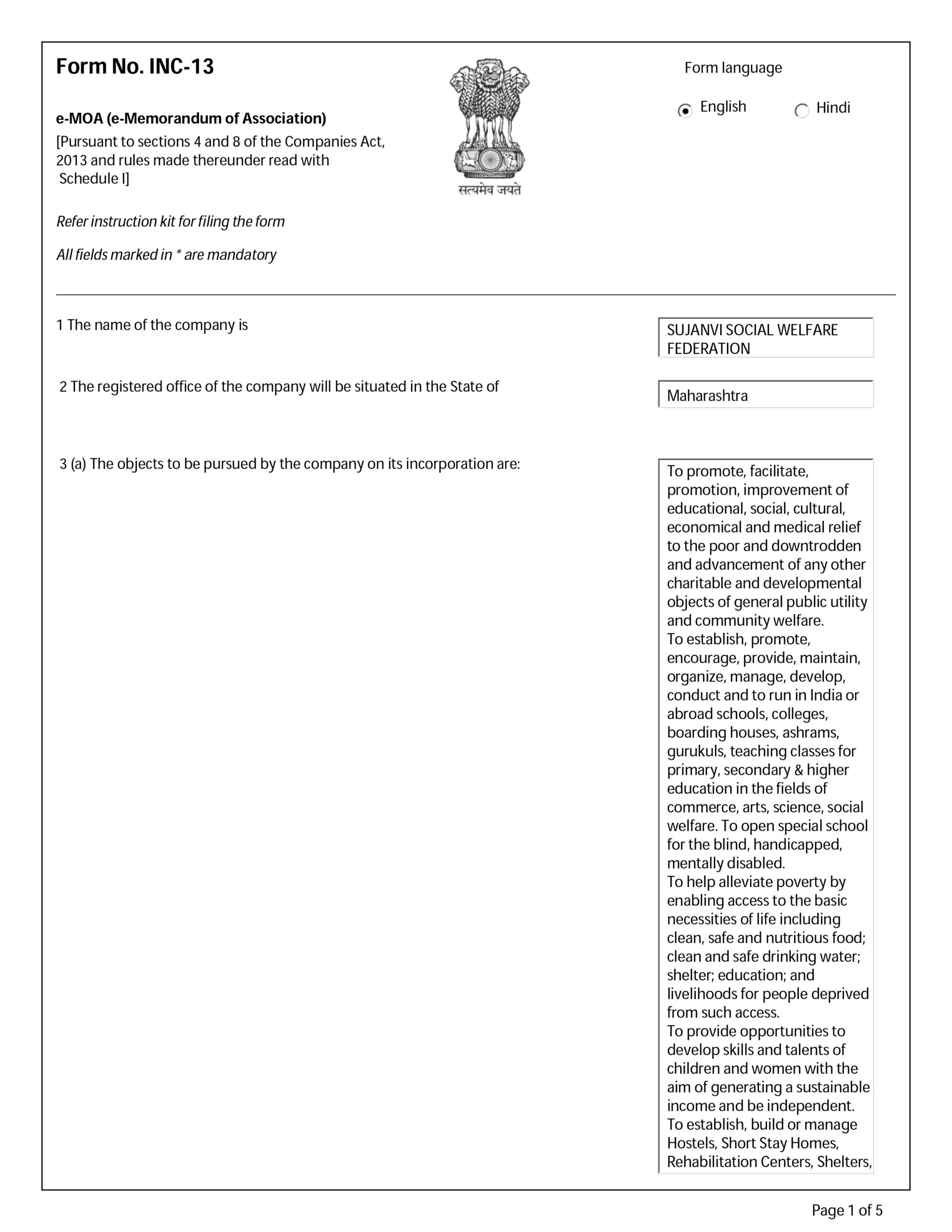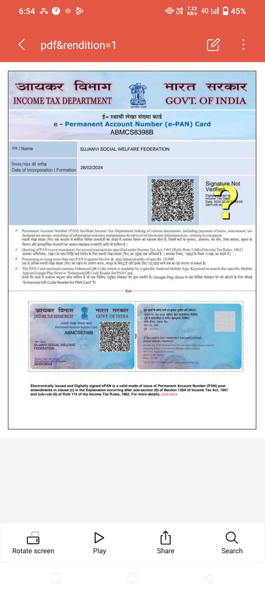 Documents Gallery Sujanvi Social Welfare Federation 12A 80G AOA Authorization Letter Ministry of Corporate Affairs MOA NGO DARPAN PAN LEI Certificate TAN Registration Certificate SUJANVI SOCIAL WELFARE FEDERATION 9001 2015 Q2A